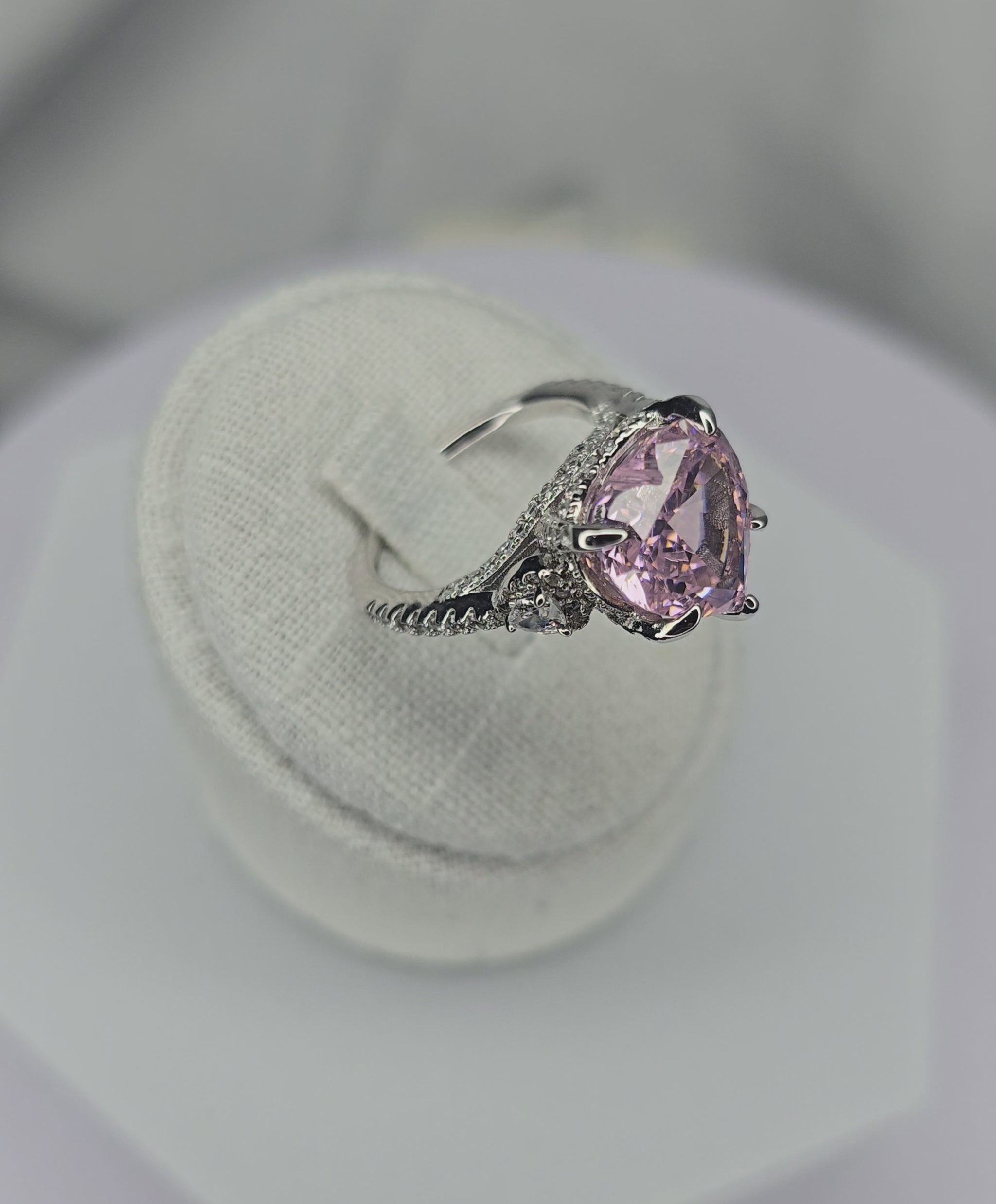 This ring is crafted from solid 925 sterling silver and set with a heart-shaped pink moissanite that delivers depth, clarity and presence. The elevated prong setting enhances brilliance, while the halo and pavé accents add structure without excess.